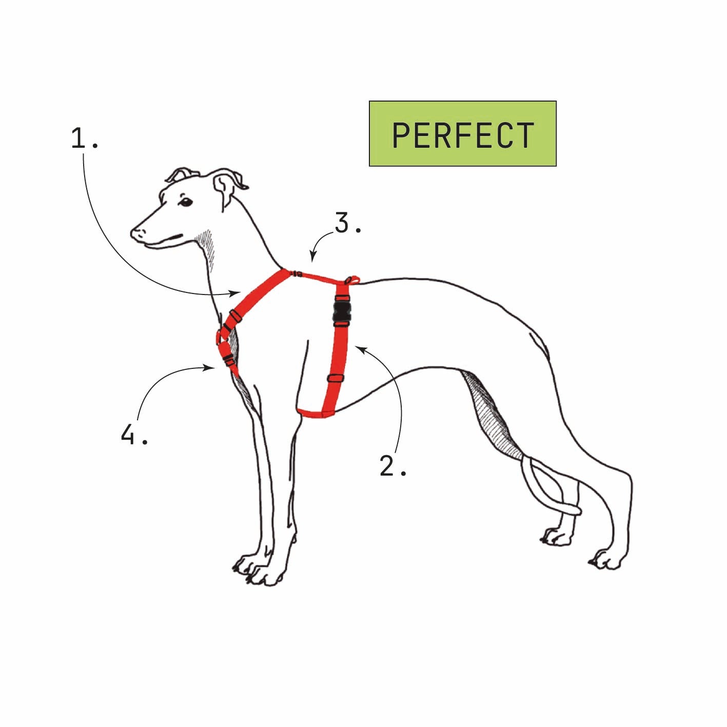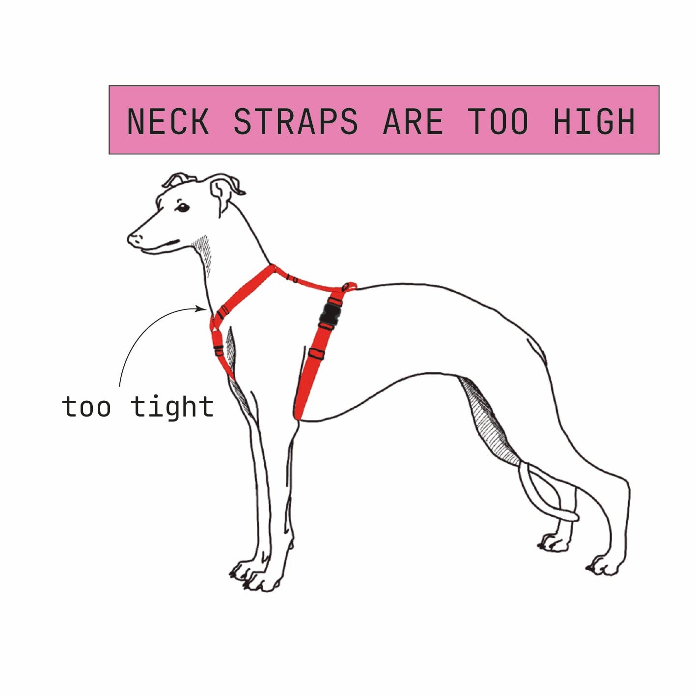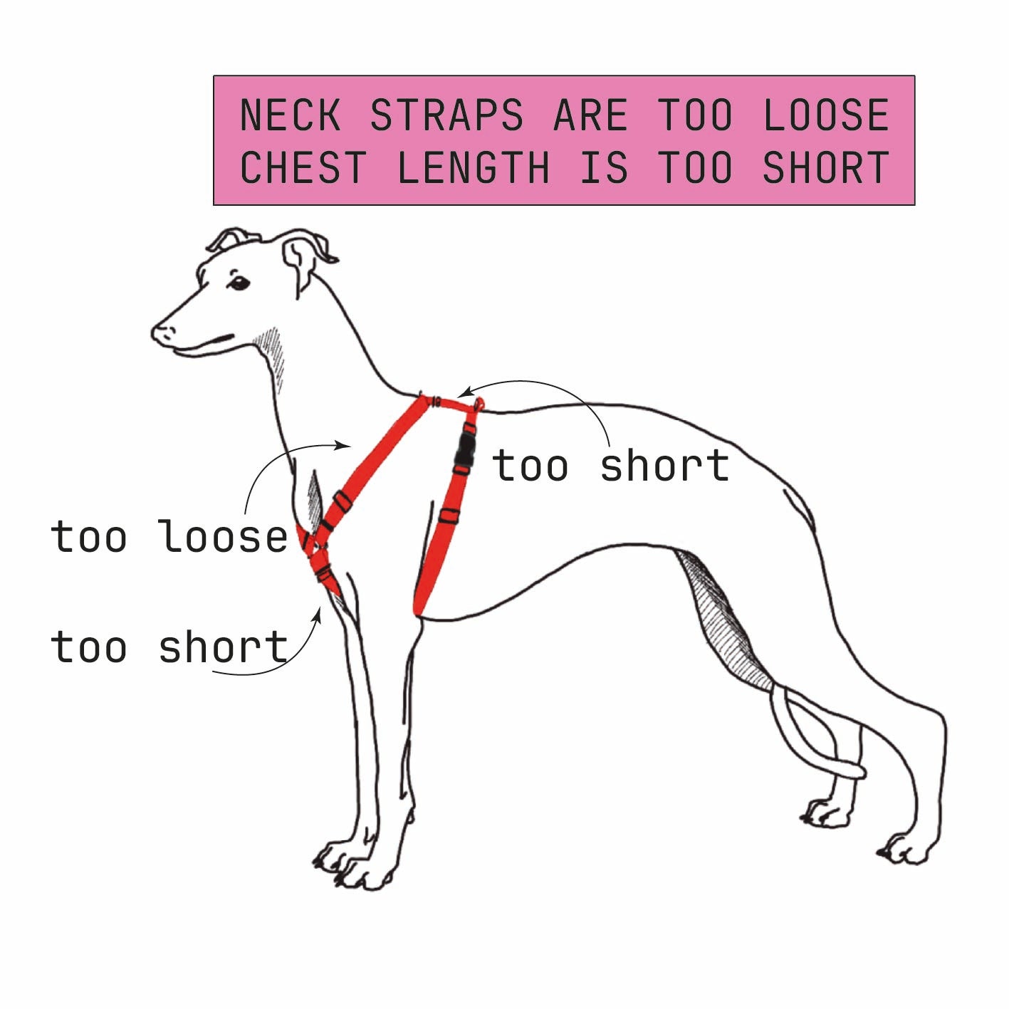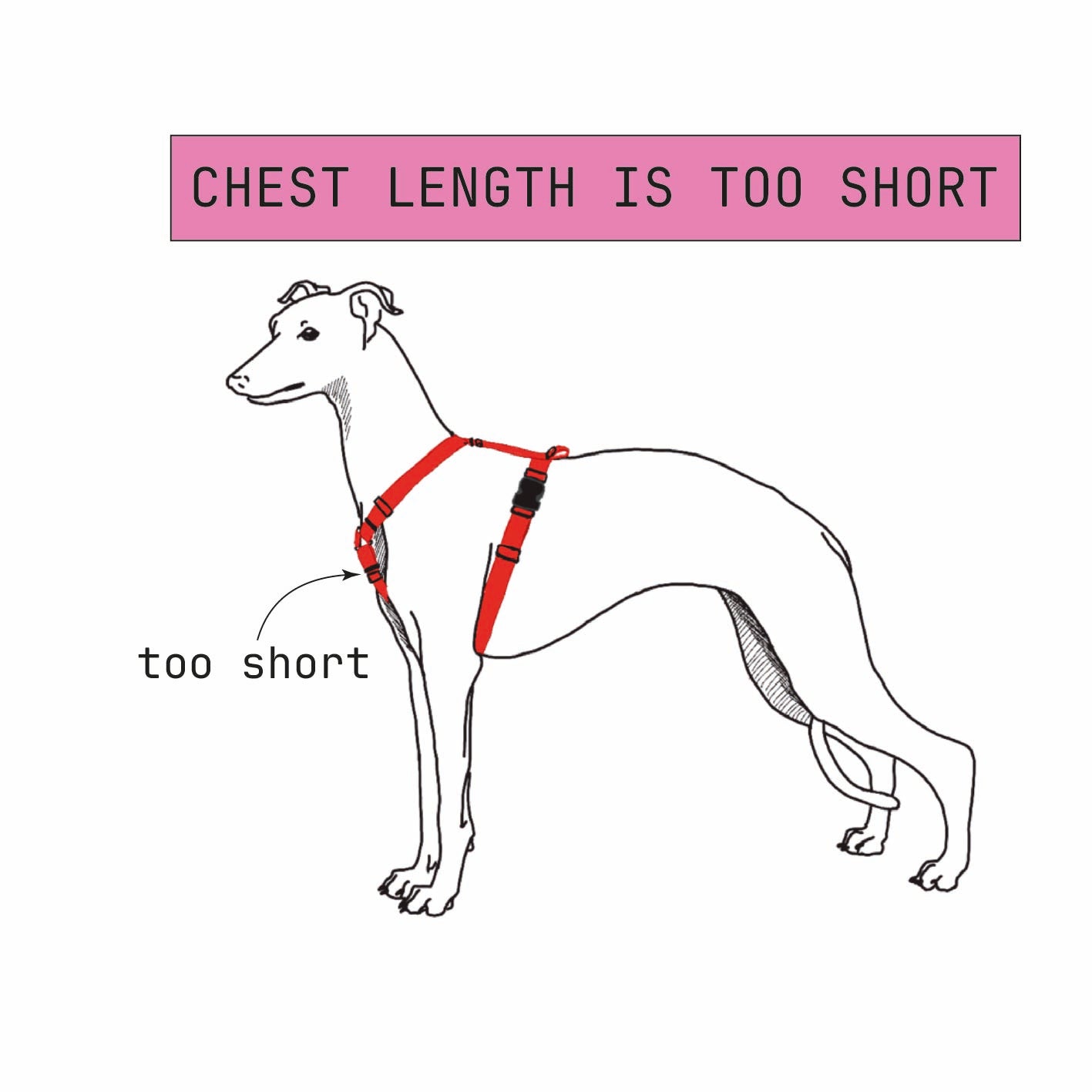 These dog breeds have a prominently protruding breastbone, which can cause a harness to shift into the armpits when worn in the standard position. To better accommodate this anatomy, adjust the harness so that the chest ring (front triangle) sits slightly below the breastbone. This will help keep the strap between the front legs from sliding up into the armpits.