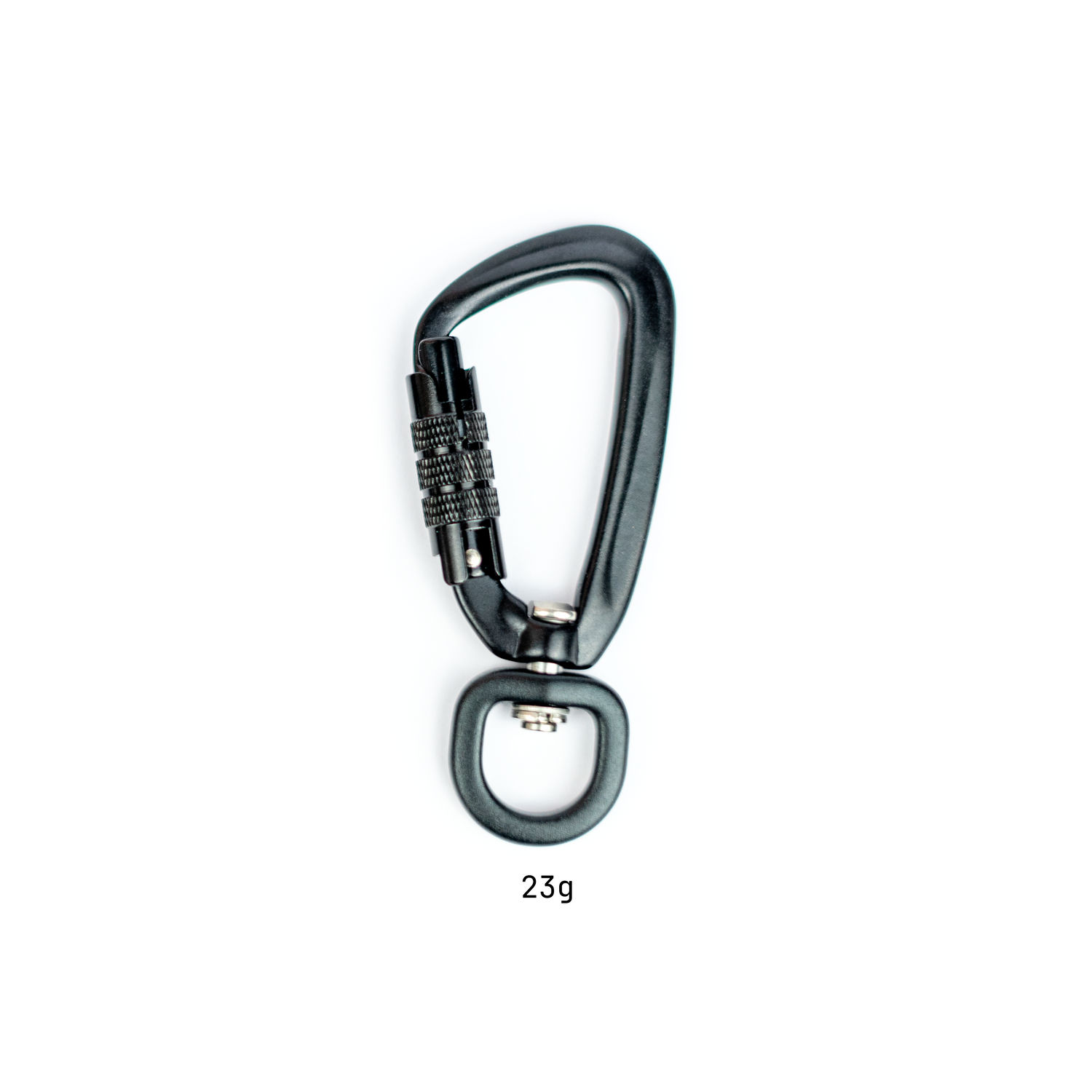 This carabiner has a pivoting mechanism that completely blocks accidental opening.